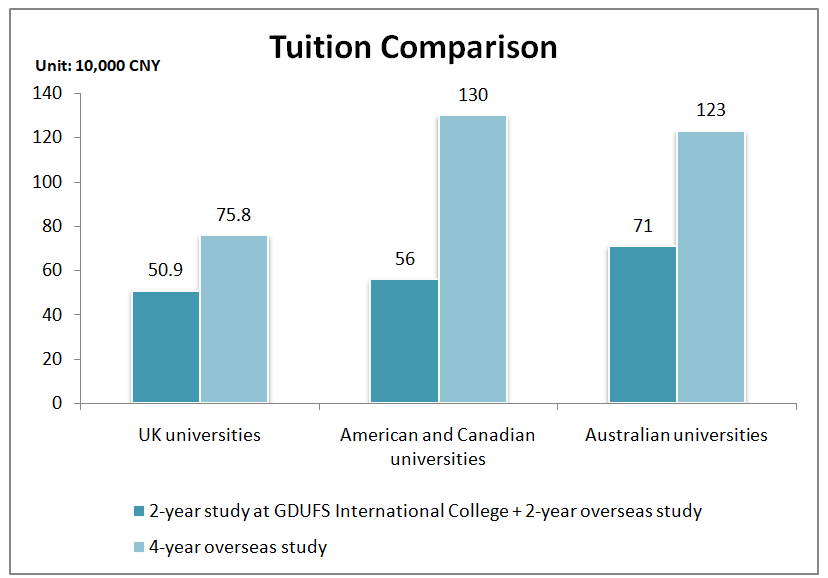 GDUFS International College only charge 65,000 CNY/year for tuition and 5,000 CNY/year for housing. Compared to the overseas universities where the tuition is more than 100,000 CNY/year and the living cost 150,000 CNY/year, our 2-year domestic training saves students a lot of money.