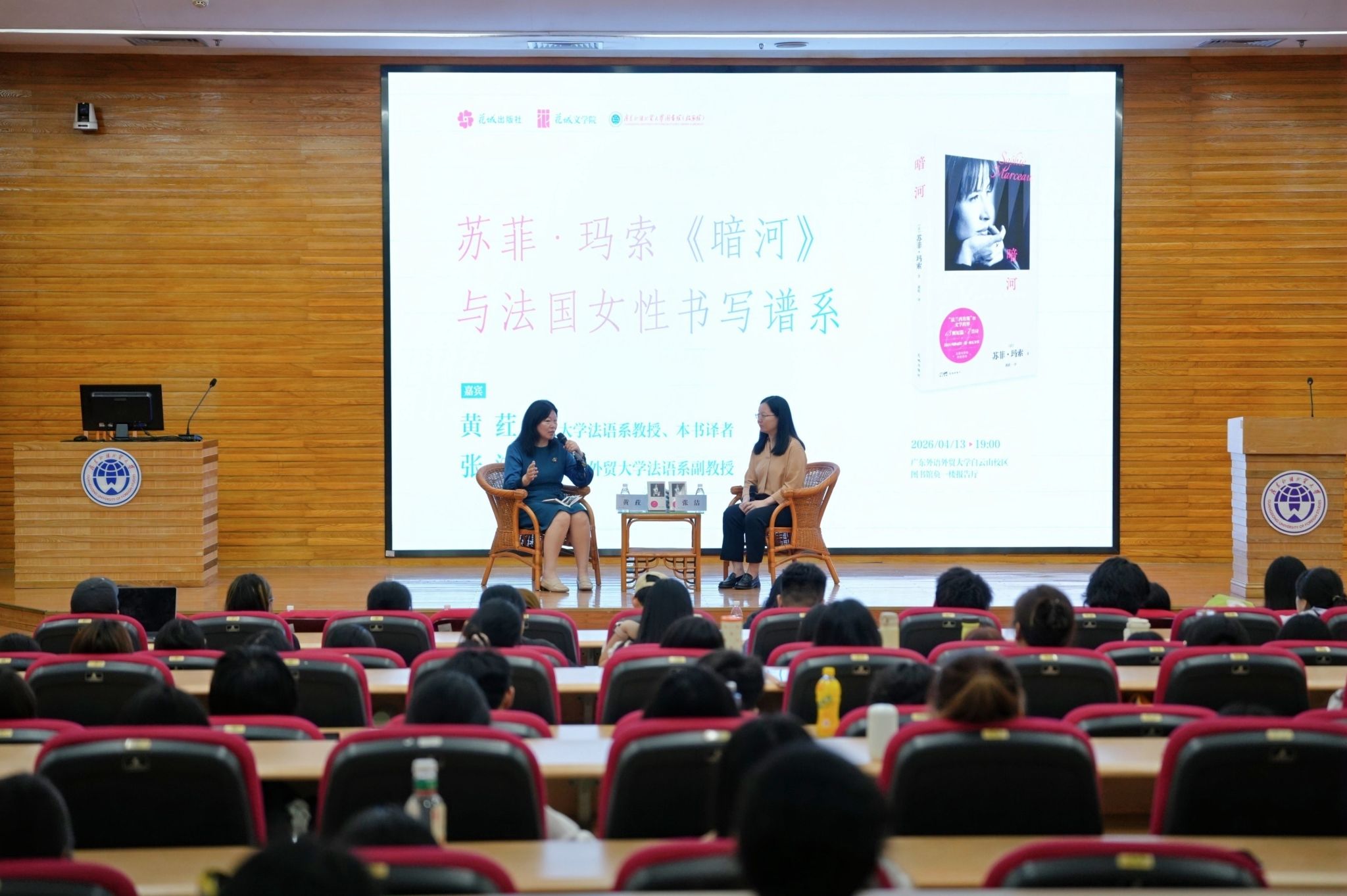 4月13日,作为我校“423世界读书日”活动月的首场重要活动,由广外图书馆(档案馆)与花城出版社联合主办的苏菲·玛索《暗河》中译本分享会在白云山校区举行。本次活动以“苏菲·玛索《暗河》与法国女性主义写作谱系”为主题,特邀本书译者、南京大学法语系教授、广外云山讲座教授黄荭与广外法语系副教授张洁展开深度对谈,吸引了众多师生及校外读者到场参与。