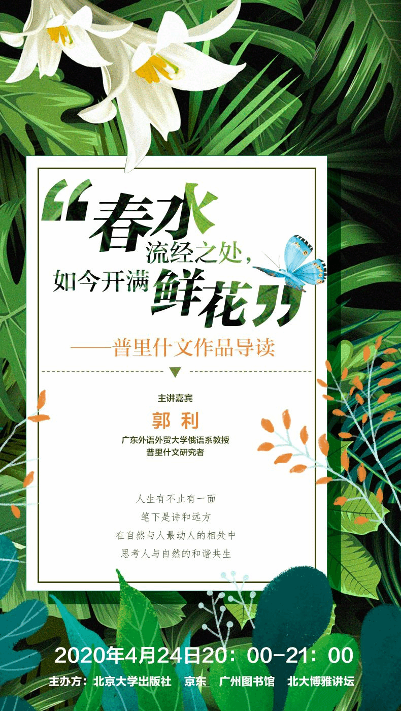 4月24日晚,广州图书馆、北京大学出版社、京东、北大博雅讲坛,邀请“普里什文作品”研究者、广东外语外贸大学俄语系郭利教授,为您在线讲述。(该活动已授权我馆分享)
