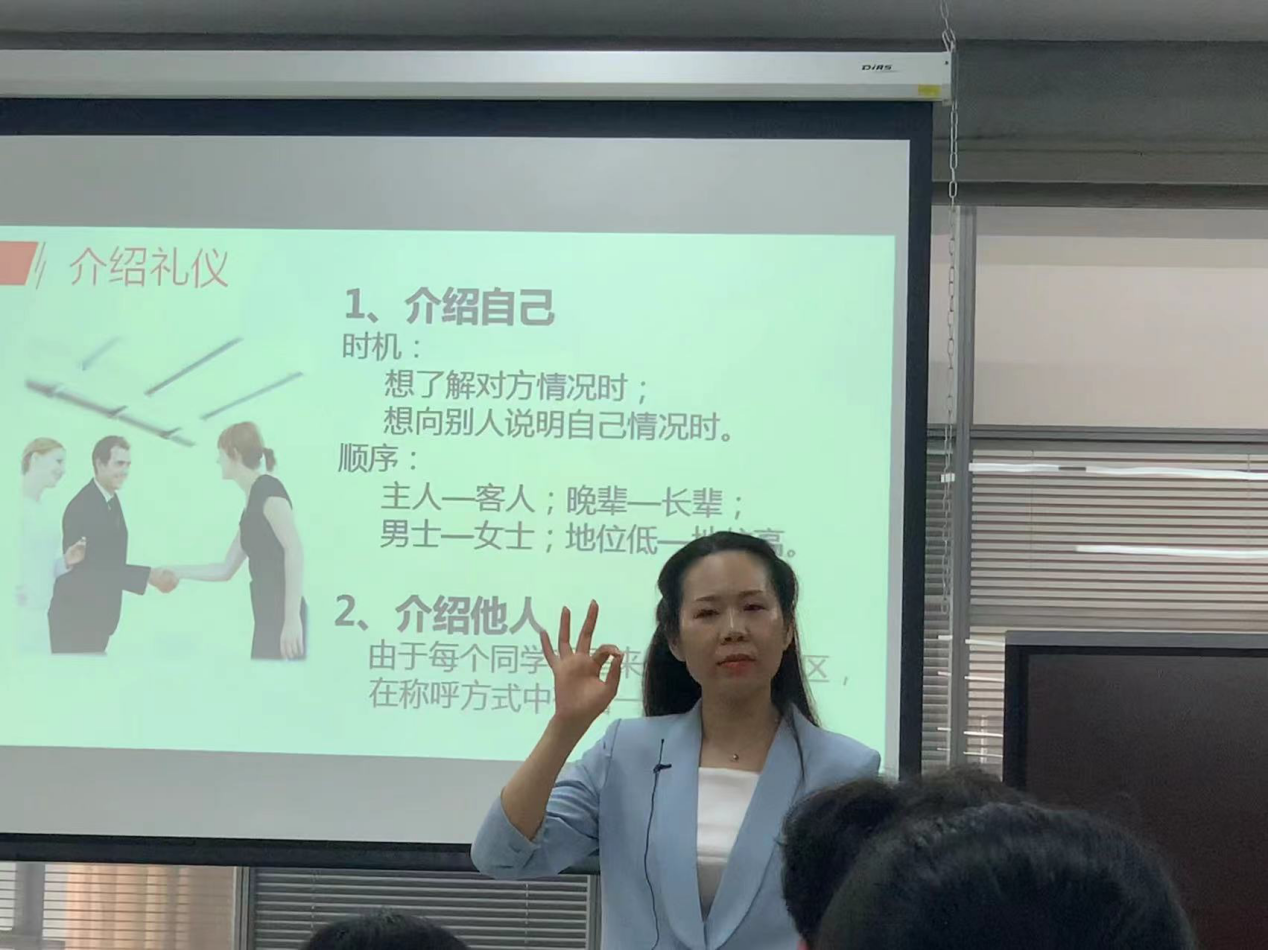 以孔子的名言“不学礼,无以立”引入话题,涂老师谈到,礼仪是人们立身处世之本,是一门待人交友的学问。人与人之间相处,要讲礼仪、懂规矩、守秩序,尽可能地让双方感到舒服自在,在举手投足间体现自己的学识和修养。