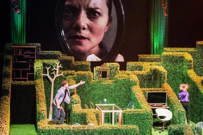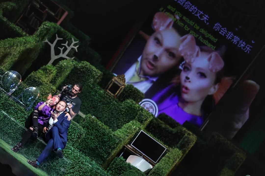 荧幕上也许是奥尔恭的facebook界面和vlog,也许是玛利亚娜snapchat的自拍滤镜,也可能是达米斯的游戏,又或者是摄像机拍摄到的画面。在摄像机面前,奥尔恭时刻注意良好的姿态,他会呵斥妻舅克莱昂特滚出画面,也会故作高深地重复克莱昂特用来讽刺他的语句。而在后台,奥尔恭一家更加地放松,他们大哭大笑,展露内心,仿佛他们知晓台上的一举一动都有观众在看着。