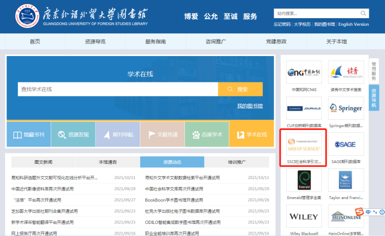 Web of Science是全球最大、覆盖学科最多的综合性学术信息资源,收录了自然科学、工程技术、社会科学等各个研究领域最具影响力的核心学术期刊,对科学研究起到重要帮助。利用Web of Science丰富而强大的检索功能,研究者可以方便快速地找到有价值的科研信息,对全面了解某学科及领域的研究信息具有重要作用。我馆现主要购买了其中的SSCI(社会科学引文索引)和A&HCI(艺术与人文引文索引)两个子集。