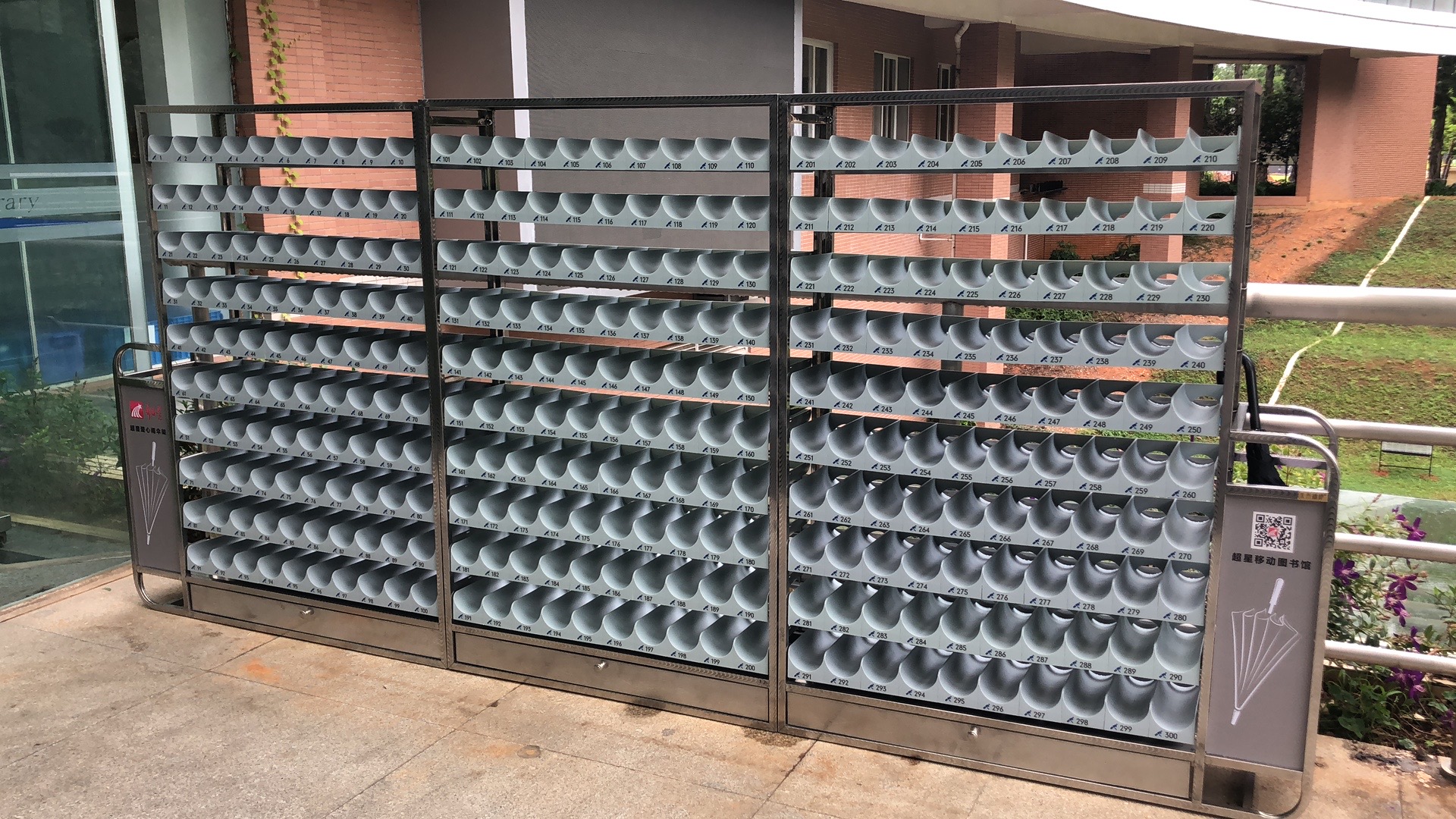 原有伞架虽然满足了置物需求,但年久生锈,新伞架设置之初,就受到广大读者好评。“原来很难找到自己的伞,现在有编号方便多了”“原来那一片地面都湿漉漉的,现在好多了。”新伞架安装好后,馆员和保安们引导读者将伞放置在雨伞架,并温馨提醒先收好伞再放置,以便节省空间,以潜移默化的教育帮助学生培养良好的行为习惯,同时也提升了工作人员的责任意识和服务意识。
