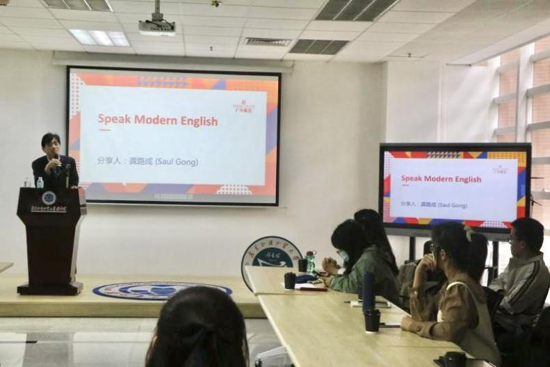 2021年10月21日下午,主题为“Speak Modern English”的新一期英语角在北校区图书馆一楼悦读沙龙室顺利开展。本次活动是图书馆与广外雅思共同合作,邀请了广外英文学院校友、商业分析师、字幕组“大神”龚路成(Saul Gong)到现场给大家带来实用的干货分享和有趣的游戏互动。现场气氛融洽,同学们在锻炼英语口语的同时收获了许多宝贵的知识。