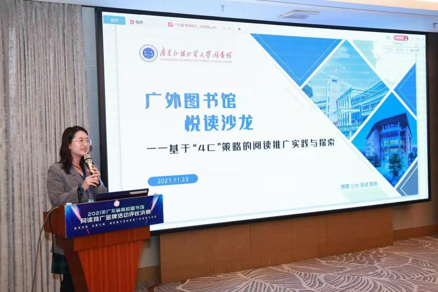 11月23日下午,2021年广东省高校图书馆阅读推广金牌活动评比决赛在广东外语外贸大学学术交流中心顺利举行。本次大赛由广东省高等学校图书情报工作指导委员会阅读推广分委会主办,广东外语外贸大学图书馆承办。来自中山大学、暨南大学、华南师范大学、广东外语外贸大学、华南农业大学、南方科技大学、澳门科技大学等粤港澳大湾区20多所高校图书馆的馆领导及从事阅读推广工作的馆员近80人出席活动。决赛同时通过“广外图书馆”抖音号进行视频直播。广东外语外贸大学图书馆副馆长钱国富担任活动主持人。