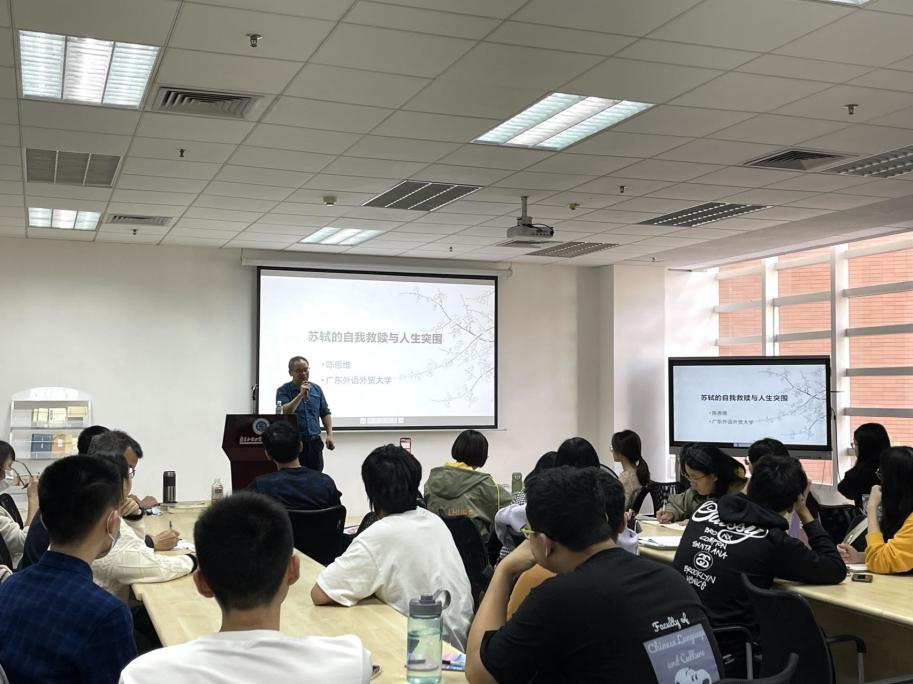 讲座开始前,陈教授用一个互动打开了话匣子,“说到苏轼,大家认为他是?”,同学们有的说“诗人”,有的说“词人”,还有“书画家”,“更是建筑家、文艺理论家!”陈教授补充。“问汝平生功业,黄州惠州儋州”,陈教授引用这句诗,从苏轼三处贬谪地为我们解读了苏轼不断修炼的心路历程。