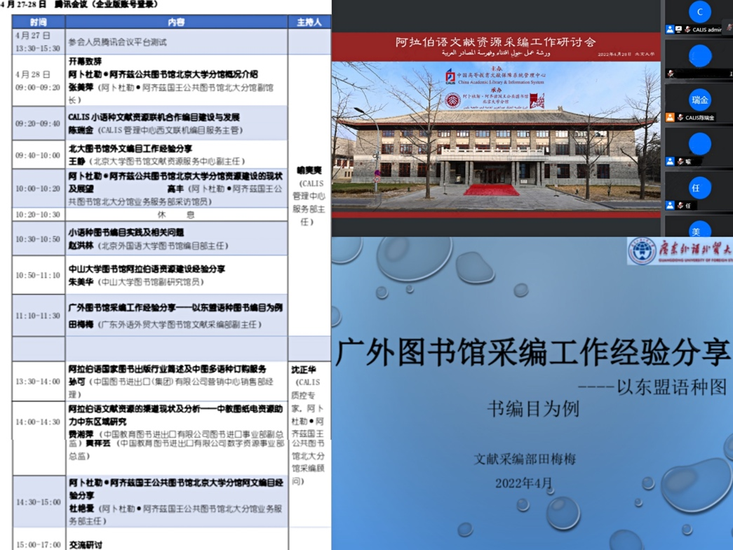 2022年4月27-28日,由中国高等教育文献保障系统(China Academic Library & Information System,简称CALIS)管理中心主办、阿卜杜勒·阿齐兹国王公共图书馆北京大学分馆承办的阿拉伯语文献资源采编研讨会在线上举行,本次会议内容包括CALIS小语种文献资源联机合作编目进展、阿拉伯语文献编目经验分享、小语种图书编目实践、东盟语种图书采编经验分享以及阿拉伯国家图书出版行业概况、本地资源数字化研究等。来自全国50多所高校图书馆、图书进出口公司的149名人员参加了本次会议。