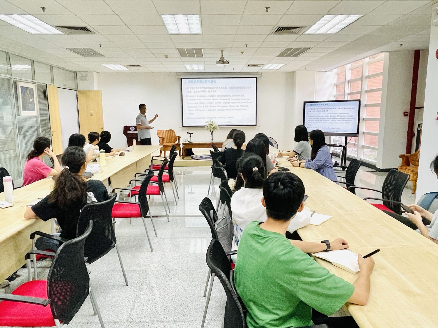 李成团教授列举了Elsevier, Cambridge, Benjiamins等法学、经济学、语言学数据库,带领读者了解Journal of pragmatics, Journal of Sociolinguistics, Discourse and Communication, Discourse Studies, Discourse & Pragmatics, Language, Context and Media, Journal of Second Language Acquisition, Intercultural Pragmatics等国际核心期刊。他还强调,图书馆花费大量经费购买国内外数据库,同学们要善加利用,使这些资源充分发挥价值。