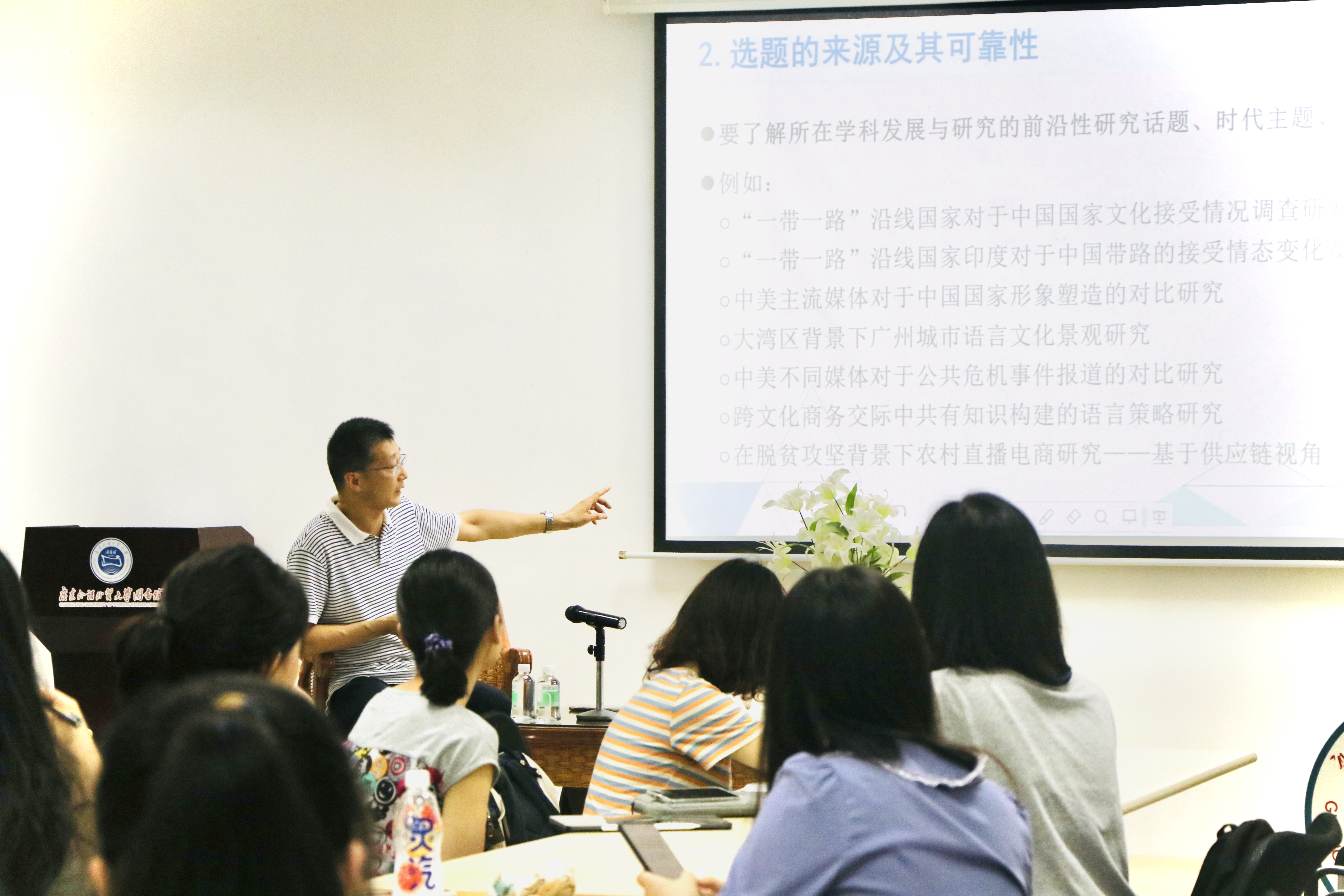 李成团教授谈到,拟定选题还需要了解所在学科发展与研究的前沿性研究话题、时代主题、发展趋势。他用“一带一路”“中国国家形象”“大湾区”等主题作为例子,指出科学研究的创新路径应当与时代背景相结合,做到心怀天下,紧跟国家发展战略。大学生在求学过程中应当熟悉学术研究的范式,为继续学术道路或顺利走入工作岗位打下基础。
