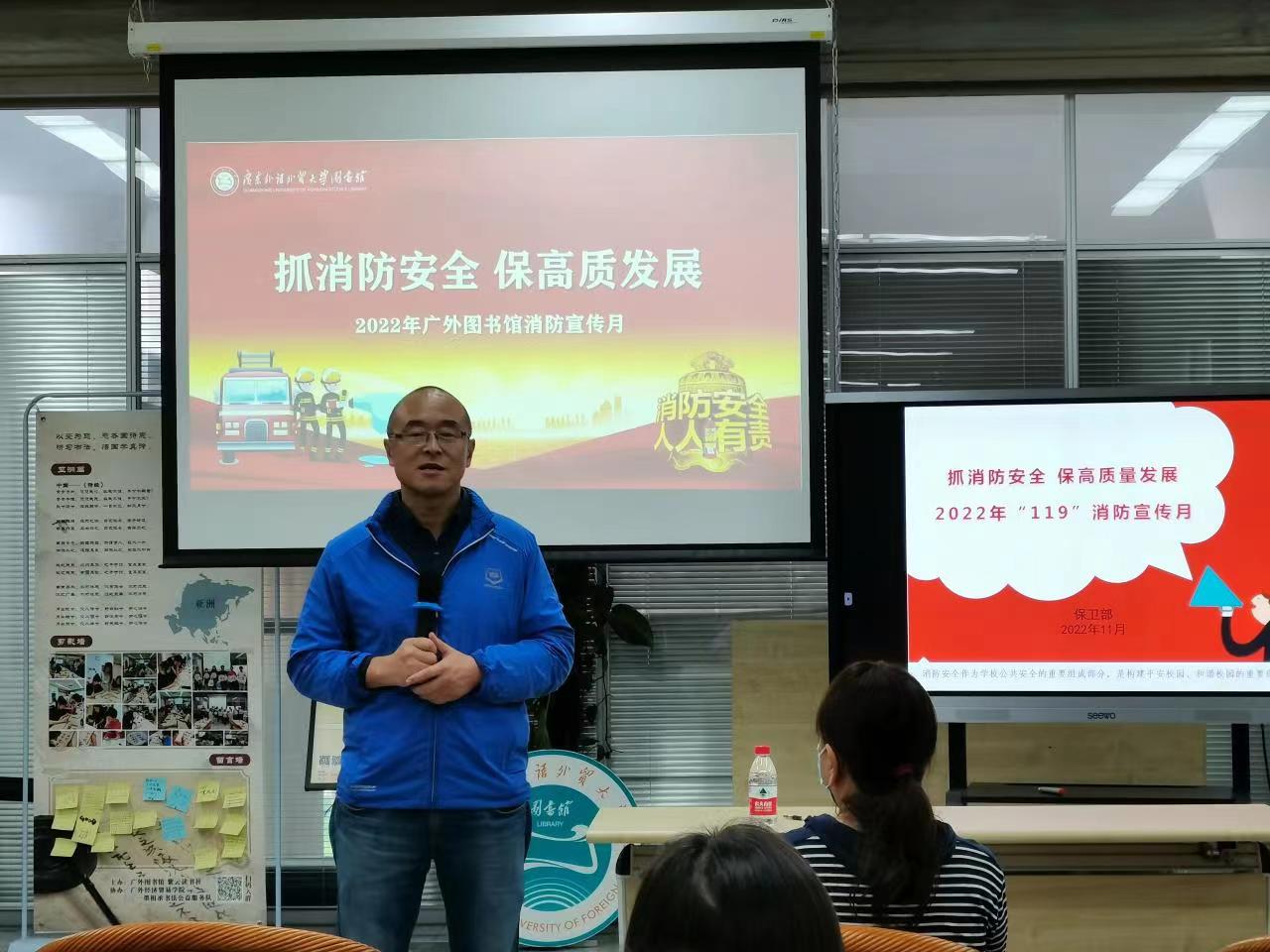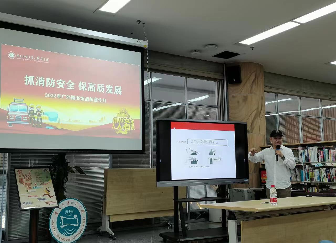 保卫处郑一贤老师为全体馆员进行消防安全知识的讲解。通过展示火灾案例,他强调了在日常生活中严格遵守安全用电用火规范的必要性,同时也向大家科普了遇到火情时如何规范报火警,在不同火灾情境中如何有针对性地进行自救与逃生等安全知识。在提到消防设施配备与更新的重要性时,郑老师肯定了广外图书馆消防设施的配置与保养工作。