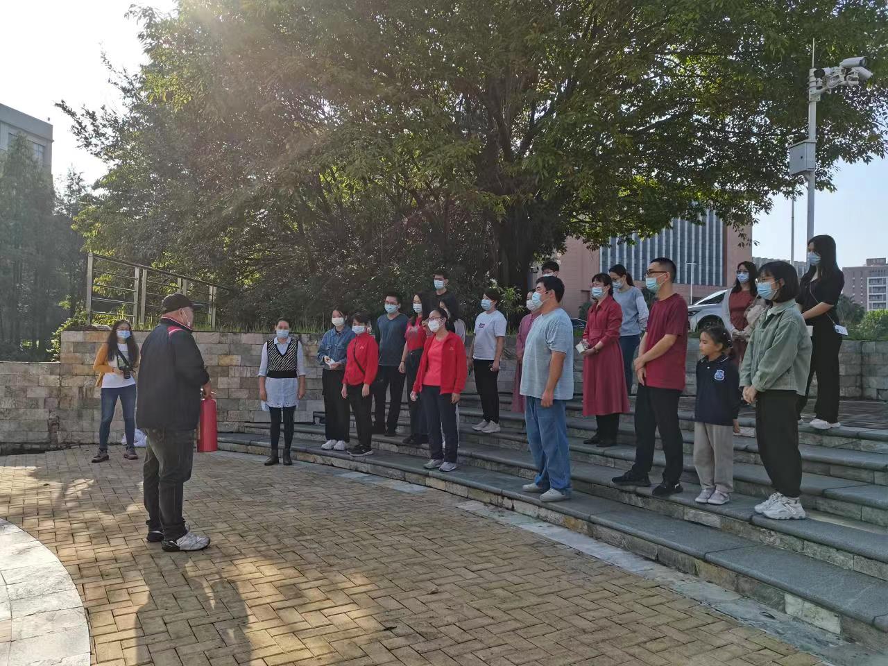撤离完成后,全体成员集合于语心湖前,进行消防器材使用的培训。在消防员的详细教学示范后,馆员们都亲身上阵,练习使用灭火器。