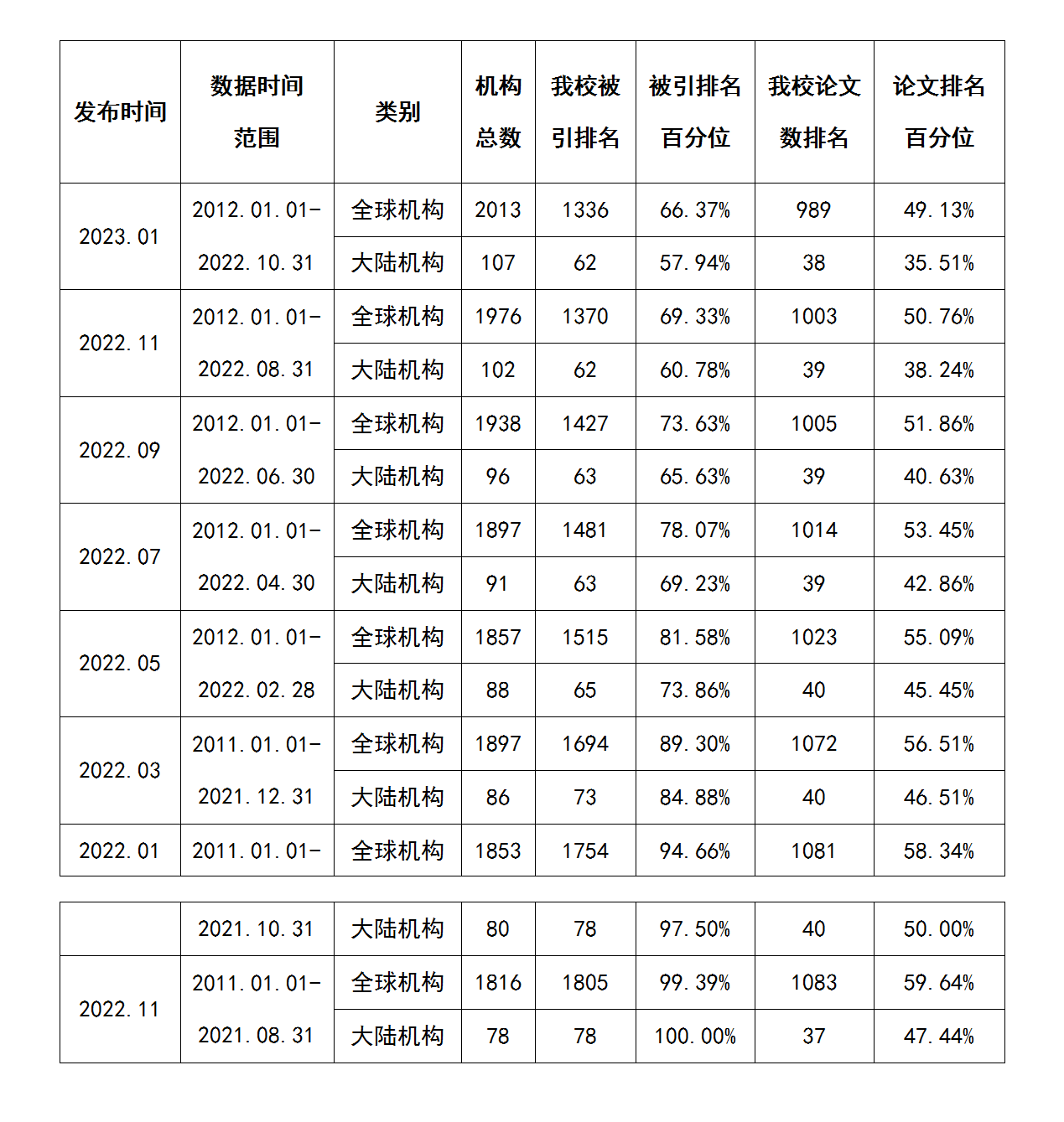 较之上期,我校社会科学总论学科在全球机构排名中被引排名百分位和论文数排名百分位在全球机构和大陆机构排名中均有所提升,详见下表。
