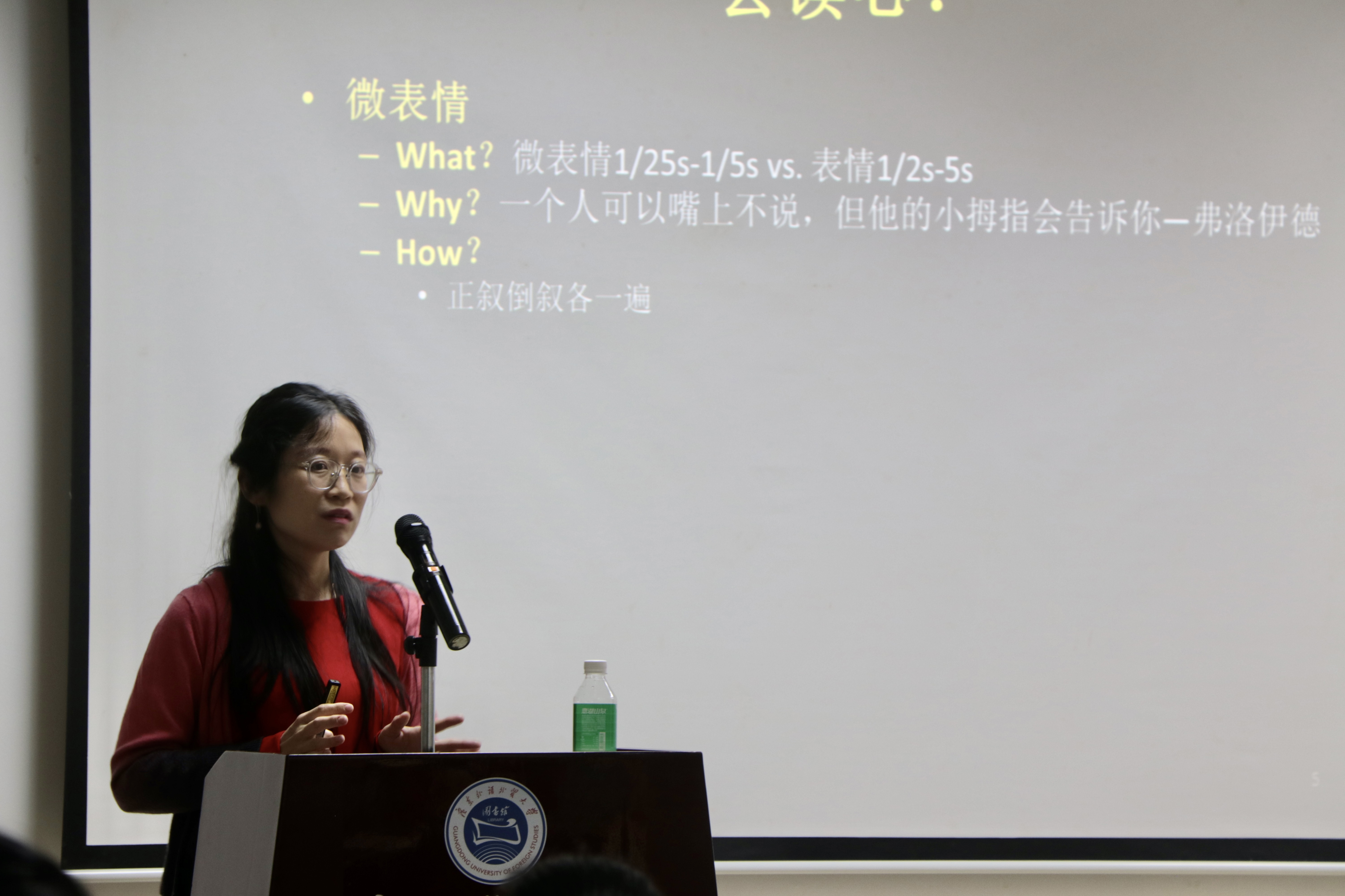 柳恒爽老师开门见山地表示,在她的心理学学习生涯中,从没有一门课教授如何推测他人想法。学习心理学的人未必会读心。她指出我们在日常生活中也会运用一些“读心”技巧,但这和心理学学习并无关联。随后她还引用“狼人杀”、“谁是卧底”等游戏的例子,向大家揭示在玩这些游戏的过程中就在使用“读心”技巧,甚至我们日常的对话交流其实也处处存在“读心”。除此以外,柳教授还从美剧《Lie to me》中为大家整理列出了“真正惊讶的表情不会超过1秒”、“想撇清关系就会回避提到名字”、“撒谎时通常不会使用比喻等修辞”等十种识别谎言的技巧,令现场的同学们觉得有趣又感同身受。