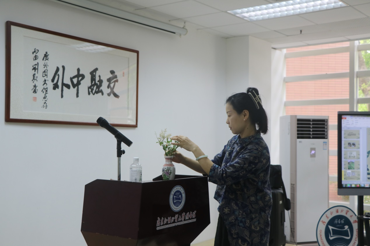 在动手演示中式插花技巧之前,谭老师先为同学们介绍了中国传统插花的历史、风格特点和常用花器。中国传统插花可追溯到3000年前,原始社会后期的陶器上就已经有了花卉纹饰,秦汉时期就有了室内“四时植花”的文字记载。此后,插花传统绵延不绝,一直传承至清代,在社会生活的方方面面都有表现。2008年,“中国传统插花”被列入第二批国家级非物质文化遗产名录,传统插花艺术由此得到了更多的关注和保护。