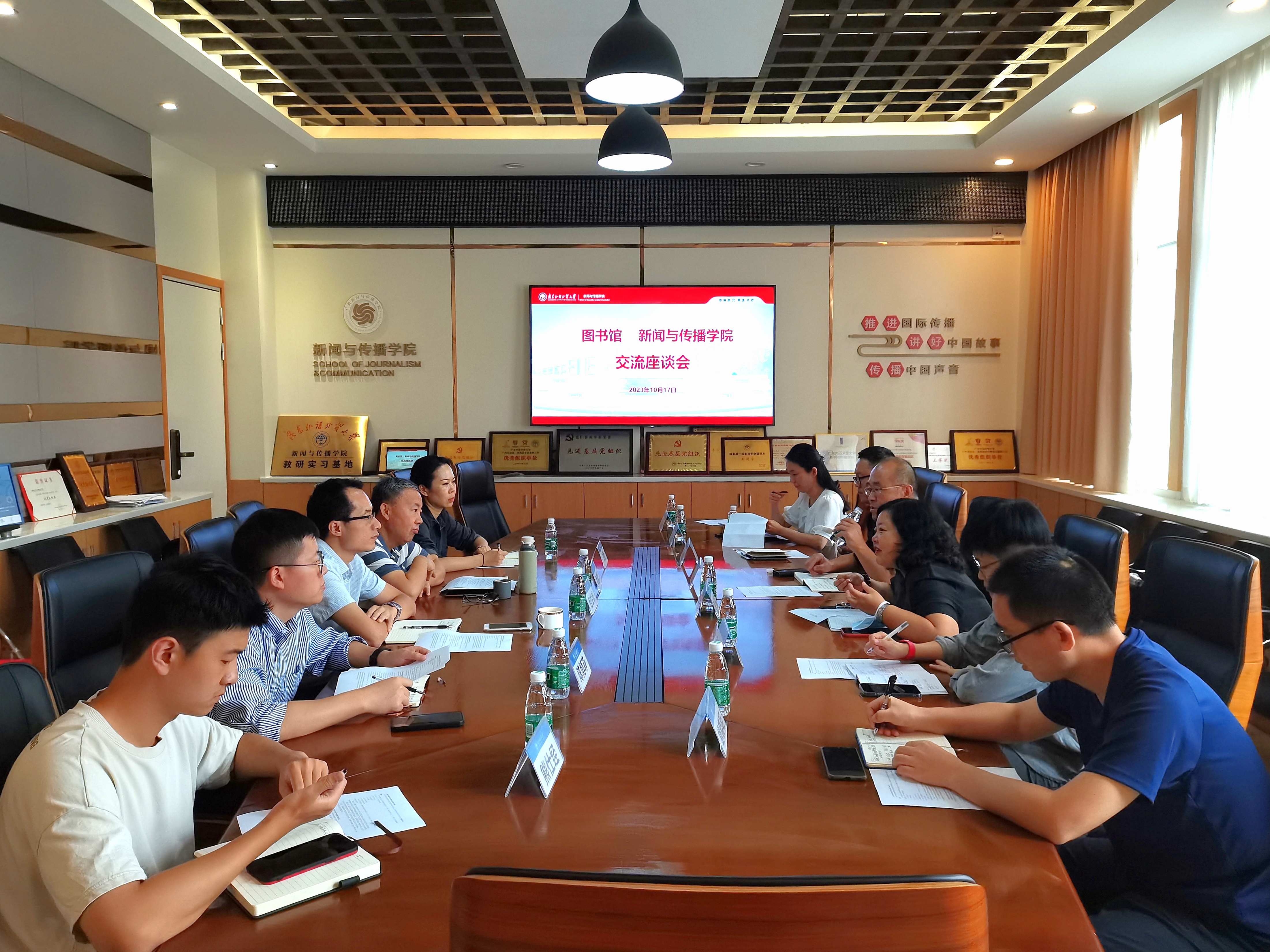 侯迎忠和包生耿等代表新闻与传播学院对图书馆(档案馆)一行到学院开展交流座谈表示热烈欢迎,并对图书馆(档案馆)长期以来为新闻与传播学院学科建设和人才培养提供的宝贵支持表示感谢。