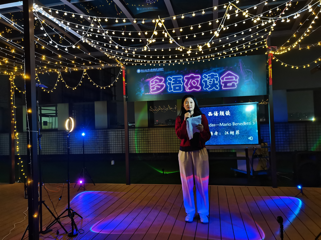 以诗歌为名,与图书馆共赴一场跨文化之旅。 11月30日晚由图书馆主办的多语夜读会,在大学城校区图书馆四楼户外朗读区拉开帷幕。在这个美好的夜晚,用朗读的方式,将文字变成音符,让语言在心灵中共鸣,共同感受语言的魅力。
