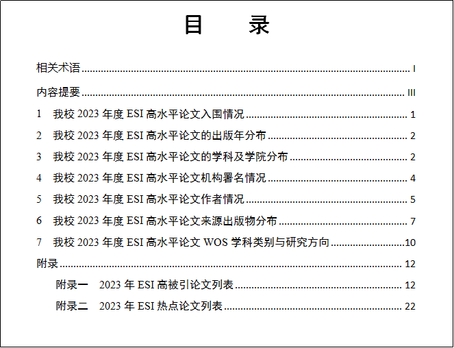 报告对ESI高水平论文的ESI入围期数、出版年份、机构与作者署名情况、ESI学科、院系、作者、来源期刊、研究方向等方面进行统计分析。
