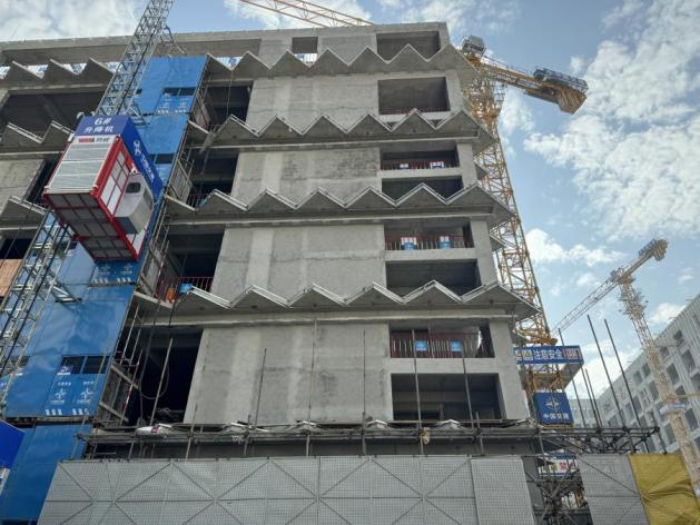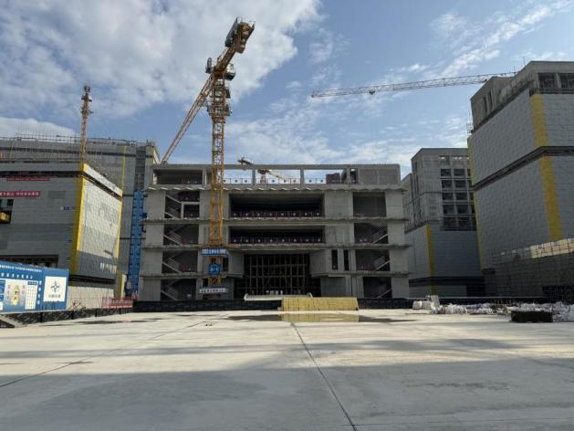 相比2023年9月实地调研时的施工进度,目前知识城校区图书馆已完成水电管预埋及墙面抹灰工程,室内柱体装修、吊顶施工有条不紊展开,室外脚手架即将拆除完毕,设计中的“折面元素”逐渐揭开面纱。
