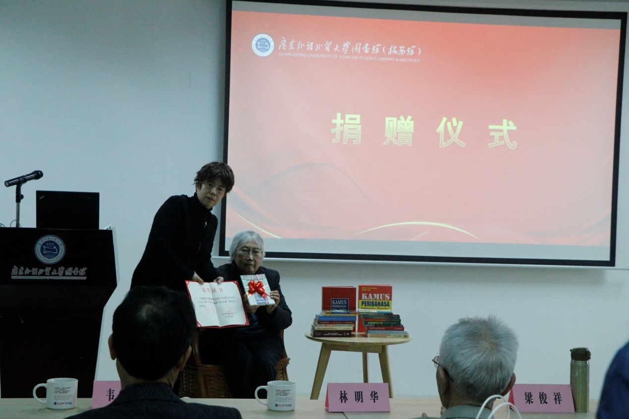 【捐赠者简介】许友年(1922-2023),广东外语外贸大学退休教授,享受国务院颁发的特殊津贴。1939-1942年在雅加达中华中学学习,1943-1945年参加抗日活动,1952-1958年在中共中央对外联络部研究处工作。曾参加中共八大的同声传译及八大文件印度尼西亚文版的翻译定稿工作。1983年调至广州外国语学院任教直至离休。曾任中国翻译协会理事,广东省及广州市翻译协会常务理事,广东省比较文学学会常务理事级广州外国语学院文学研究所所长等职。主要著作有《论马来民歌》《印度尼西亚华人马来语文学》《马来民歌研究》《马来语-汉语谚语词典》《印度尼西亚语-华语谚语词典》等,译著有《印度尼西亚民间故事》《阿布·纳瓦斯的故事》等。