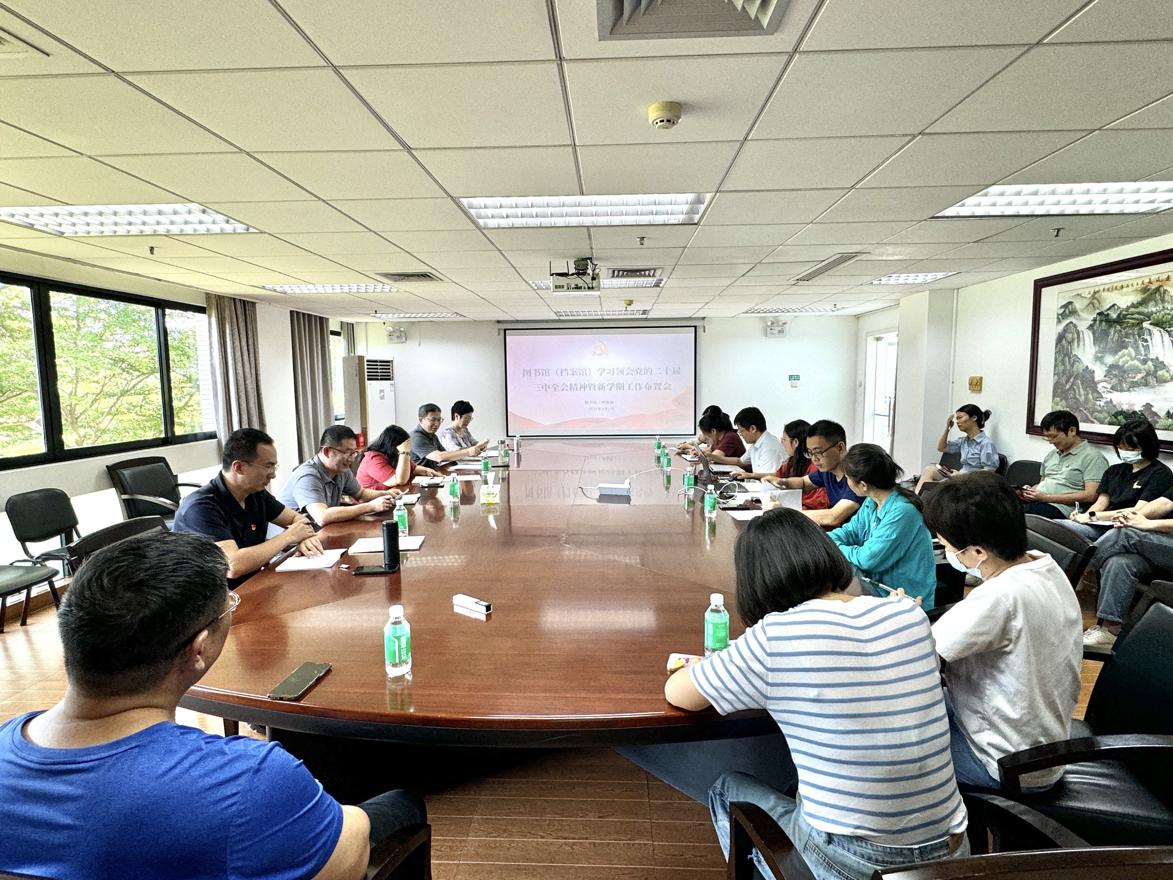 9月5日上午,图书馆(档案馆)在白云山校区图书馆四楼会议室召开学习领会党的二十届三中全会精神暨新学期工作布置会。全体馆领导、部室主任、业务小组长、各党支部书记参加会议,陈平仲副馆长主持会议。