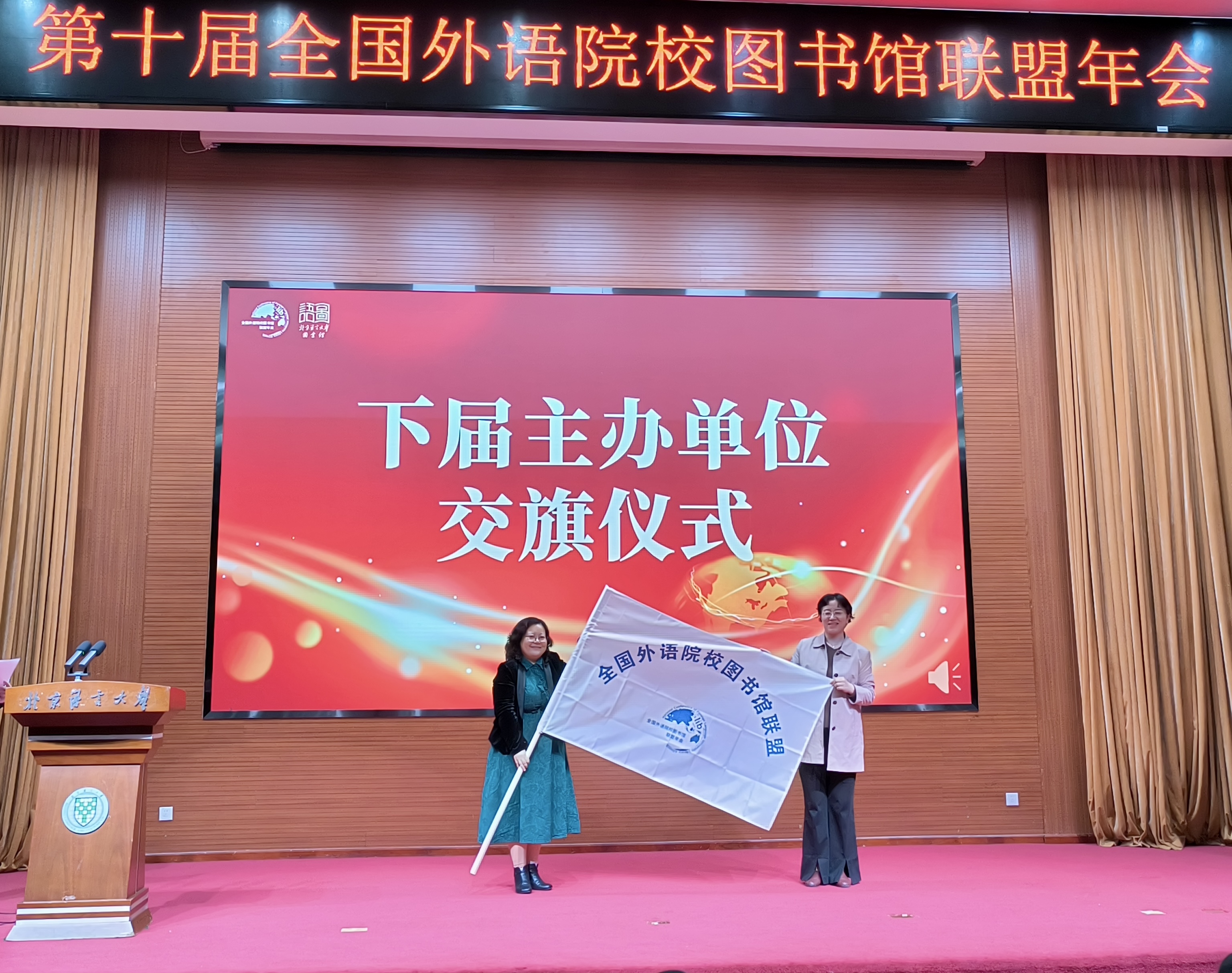 会议闭幕式举行了交旗仪式,第十一届全国外语院校图书馆联盟年会将由我馆承办,陈红霞馆长从此次年会承办方邓亚文书记手中接过联盟旗帜,并代表下届年会承办方发言。她表示,明年年会恰逢广外建校60周年,期待各成员馆一如既往地支持和参与,期待与大家相约美丽花城。通过参加此次年会,增强了我馆与全国其他外语院校图书馆的联系,同时也进一步推动了图书馆业务创新与学术交流。