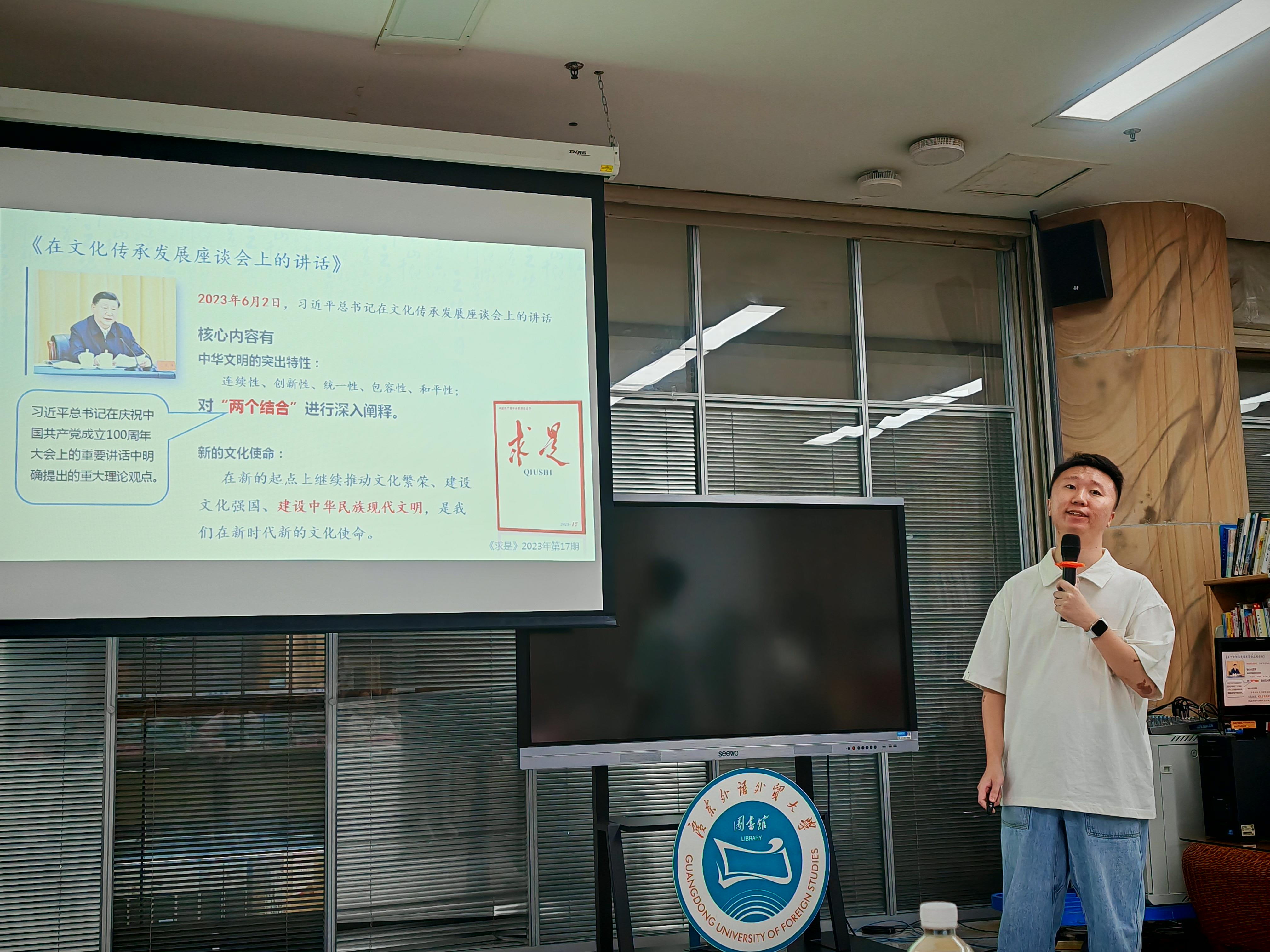 会中,朱东林、邹敏诗、张咏淇、冼楚瑜等同学就《在文化传承发展座谈会上的讲话》《论持久战》《星星之火,可以燎原》《改造我们的学习》分享了读书感悟。邓晶晶老师对以上同学读书分享内容进行了精彩的专业点评。文金贝老师对读书分享会进行总结,并为参加读书分享的同学颁发纪念品,读书分享会完美落幕。