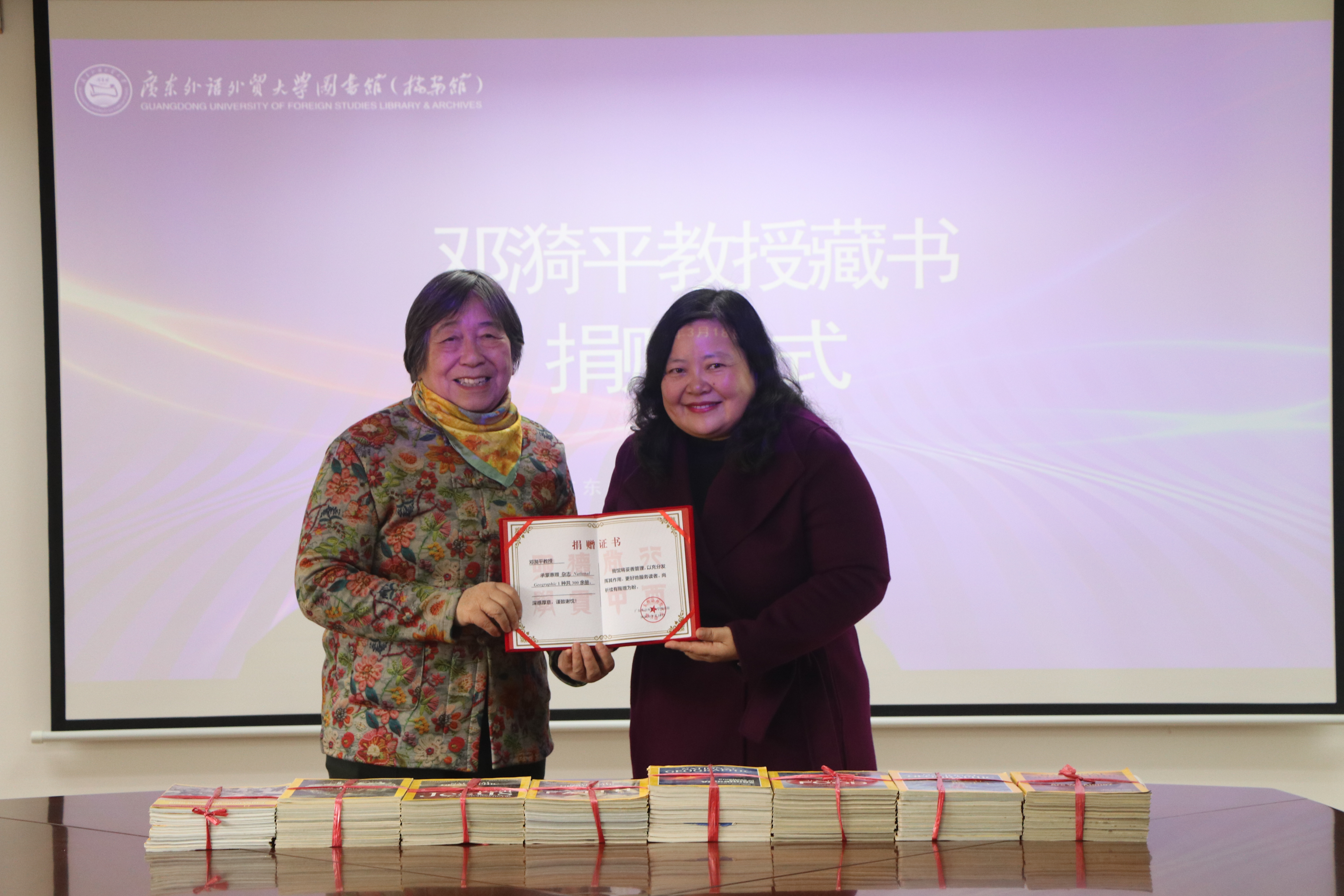 仪式上,陈小涟女士代表邓漪平教授,将National Geographic捐赠给图书馆,陈红霞馆长给陈小涟女士颁发了捐赠证书并赠送了纪念品。