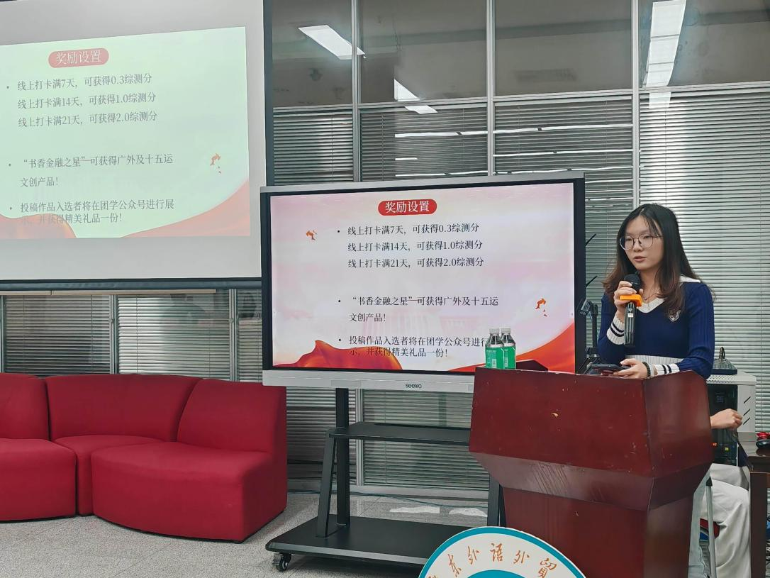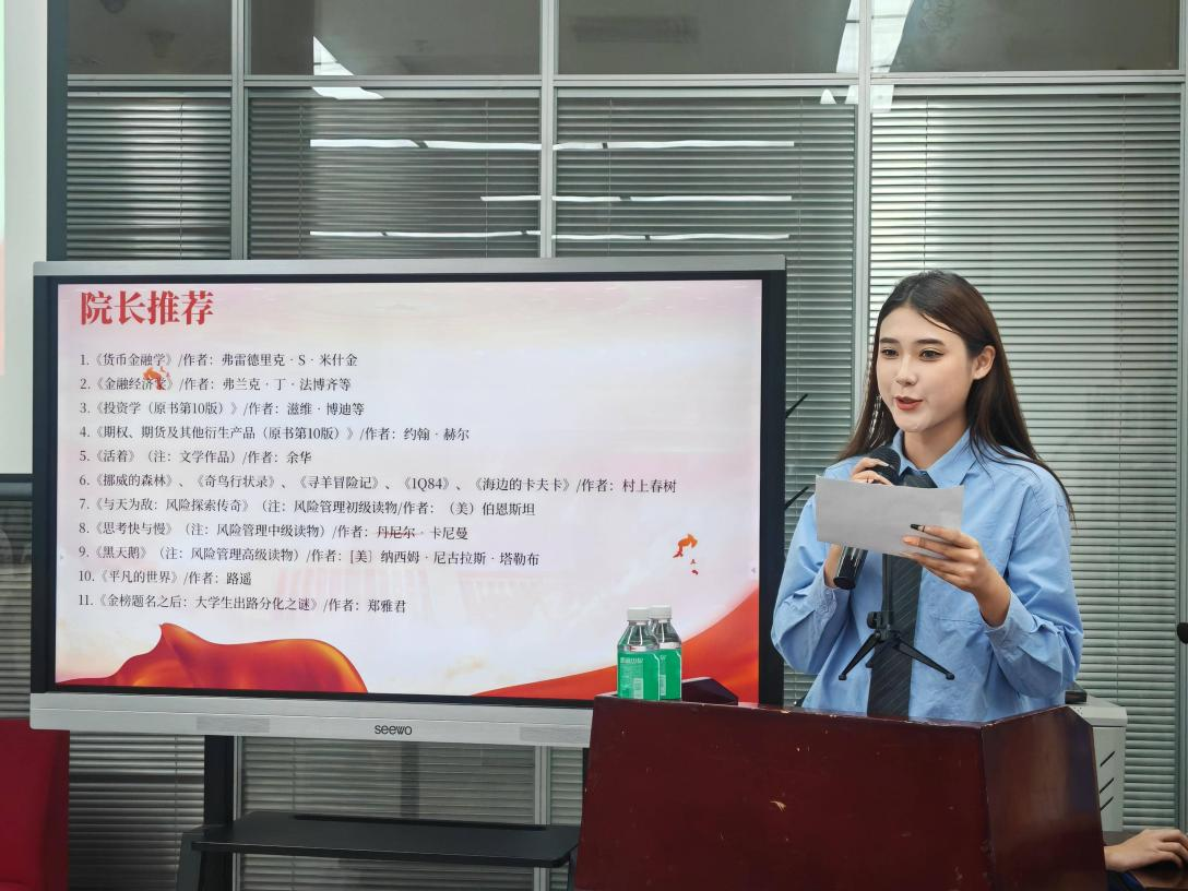 活动中,金融学院团委学生会拓展交流部部长刘韵介绍了“书香金融”系列活动的具体形式,包括每日线上打卡、线下读书分享会及主题投稿活动,大家可根据自身需求自由选择参与方式。为引导学生精准阅读,启动仪式还发布了由学院院长、各系主任共同遴选的推荐书单。书单兼顾经典性、前沿性与可读性,涵盖金融专业经典、跨学科读物及人文哲思类书籍,为同学们搭建起兼具专业深度与人文温度的阅读体系。