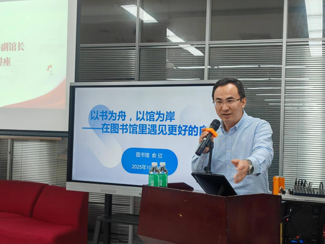 随后,俞欣以“以书为舟,以馆为岸——在图书馆里遇见更好的自己”为题展开讲座。他打破“图书馆仅是藏书与自习场所”的传统认知,指出图书馆是治学之基、视野之窗、成长之阶,详细解读了学校图书馆在文献资源供给、学术空间搭建、文化活动组织等方面的综合功能,深刻阐释其在保障学术研究、促进文化交流、实现知识与情感共鸣等方面的多重价值。针对如何高效阅读,俞欣提出“破界阅读”理念,建议同学们从专业深耕、跨界拓展、哲思启迪三个维度丰富阅读内容;同时强调,在数智时代要善用图书馆数字资源,但不依赖技术,始终坚守深度阅读与独立思考的本质。此外,他还鼓励同学们依托图书馆资源规划职业发展,通过文献研读、技能培训、实践锻炼提升综合素养,以应对金融行业的变革与挑战。整场讲座内容充实、视角独到、案例鲜活,为学子打开了全新的阅读视野,引发全场强烈共鸣。