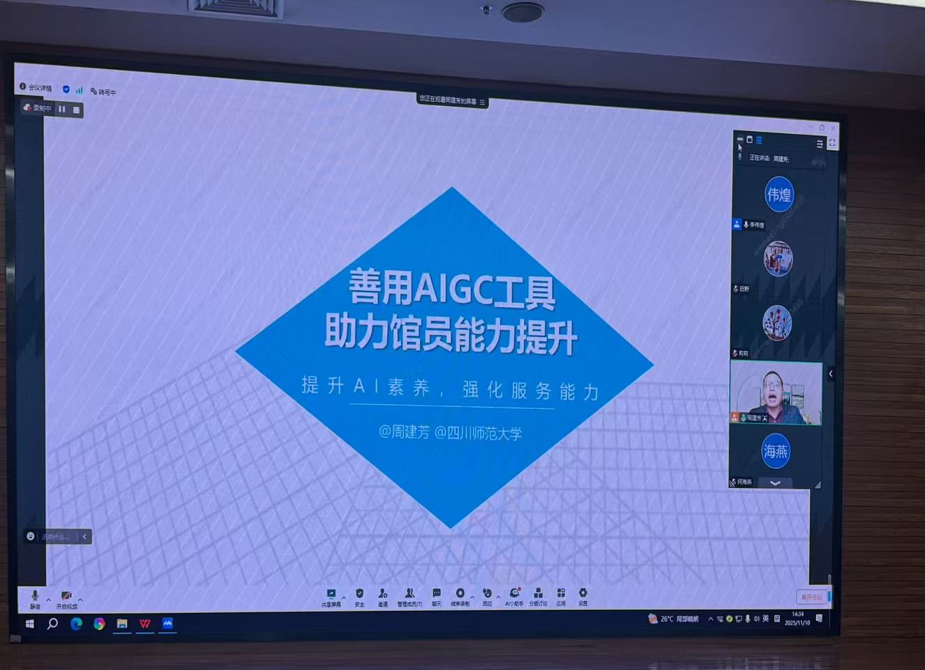 在 AIGC 技术重塑行业生态、驱动服务模式革新的时代背景下,11 月 10 日下午,图书馆(档案馆)特邀四川师范大学图书馆研究馆员、中国图书馆学会学术委员会信息素养工作组成员周建芳博士,以线上形式开展题为 “善用AIGC工具 助力馆员能力提升”的专题讲座。本次讲座作为馆内党建项目 “学习强馆” 的第四讲,由图书馆(档案馆)馆长陈红霞主持,为 AI 时代图书馆员的能力升级与职业发展搭建了专业交流平台。