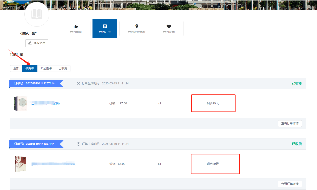 5.收到书后,请在平台“我的订单”点击确认收货,可在“借购中”查看图书剩余天数。