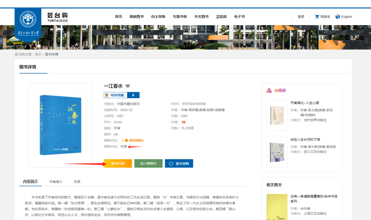 3.因平台提供动态现货库存,出现“无库存”提示时,读者可不同时间多次检索,也可向图书馆荐购,由图书馆跟进采购,优先加工上架;
