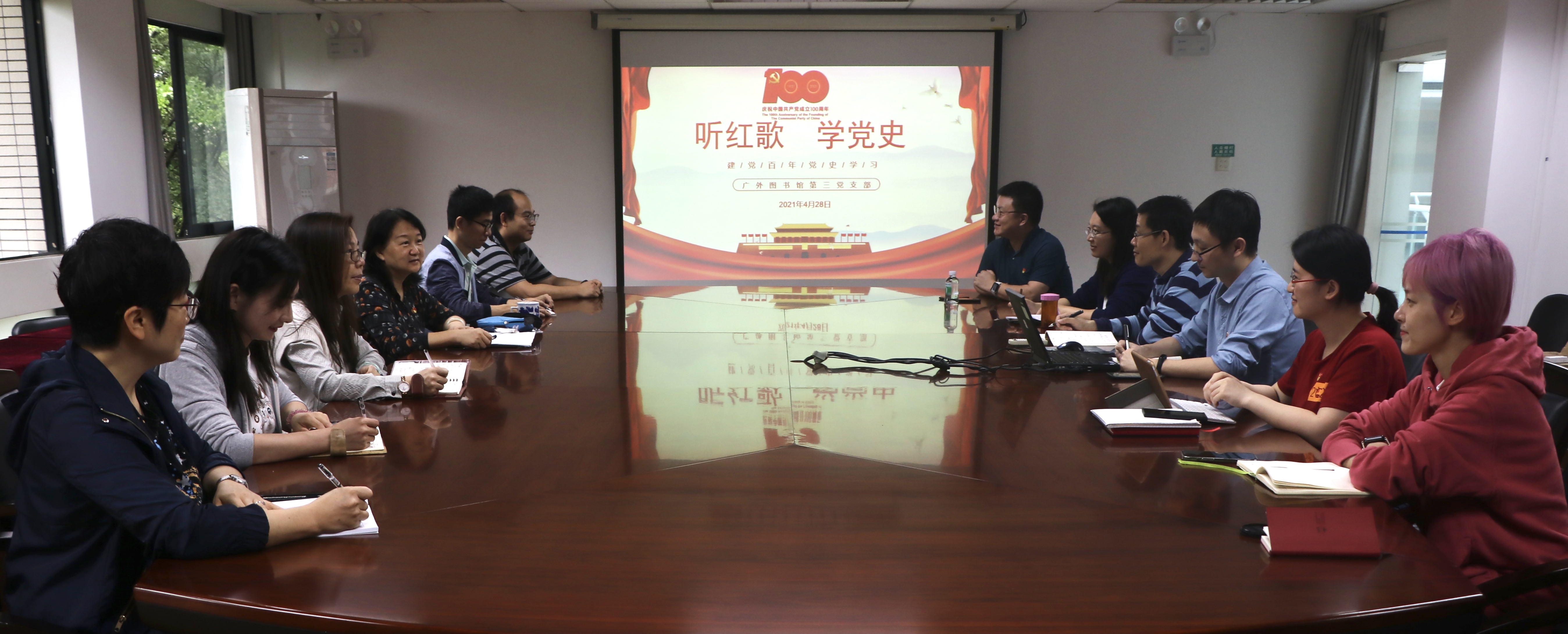 为庆祝建党一百周年,贯彻落实习近平总书记在党史学习教育动员大会上的讲话精神,4月28日上午,图书馆第三党支部在北校区图书馆四楼会议室召开“听红歌 学党史”专题组织生活会。图书馆党总支书记范静静,党总支委员、副馆长钱国富及第三党支部全体党员参加会议。会议由党支部书记周剑峰同志主持。
